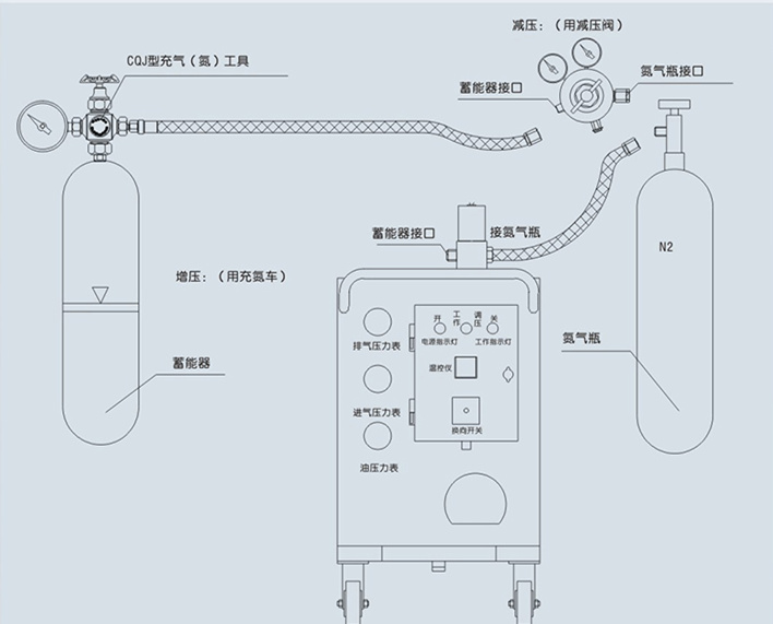CQJ系列蓄能器充氮工具是蓄能器進行充氣、補氣、修正氣壓和檢查充氣壓力等必不可少的專用工具。它具有結構緊湊、安全可靠、承高壓、耐沖擊、使用方便等特點。